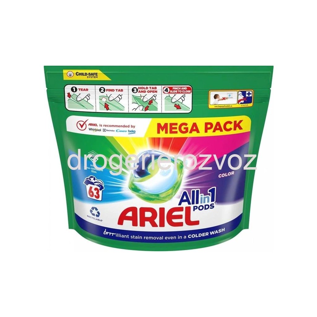 Ariel All in 1 Pods Color gelové kapsle 63 kusů. Vše v jednom: efektivní praní, odstraňování skvrn, svěží vůně, ochrana a rozjasňování prádla, účinkuje již od 20 stupňů. Nejkoncentrovanější prací prostředek od Arielu – pouze 28 ml pracího prostředku v jedné kapsli. Vložte jednu kapsli Ariel přímo do zadní části bubnu pračky. 2. Přidejte špinavé prádlo. 3. Kapsle se zcela rozpustí a odstraní řadu odolných skvrn. Uchovávejte mimo dosah dětí stejně jako jiné čisticí prostředky pro domácnost.