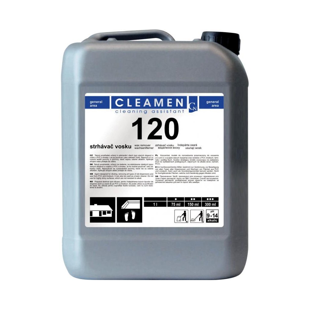 Specifikace Cleamen 120 strhávač vosku 5 l Popis produktu Cleamen 120 odstraňovač vosku Prostředek, určený pro odstranění i opravy všech typů starých disperzí a vosků z PVC a linolea. Lze jej používat i jako základní čistič, hlavně před pokládáním vosků, účinně působí na zašlapanou špínu na všech podlahových krytinách odolných alkáliím (dlažby, PVC, starší linoleum, teraso, cihelné povrchy, nelesklá žula). Odstraňování disperzí: Naředěný roztok (viz.etiketa) aplikujte na povrch buď z nádrže podlahového kotoučového stroje nebo ručně mopem. Okraje očistěte ručním podlahovým padem. Strojem s modrým padem při standardní rychlosti odstraňte staré vrstvy vosku a odsajte vysavačem na mokré sání. Povrch poté zneutralizujte vodou. Před aplikací vosku nechte dobře vyschnout. Oprava disperzí: Naředěný roztok (cca 1:100) z tlakového rozprašovače aplikujte na odstraňované části tak, aby byl povrch vlhký a podlahovým kotoučovým strojem s vysokou rychlostí a modrým padem odstraňte horní ošlapanou vrstvu. Vymopujte čistou vodou celý povrch a nechte vyschnout. Na vyschlý povrch aplikujte rozprašovačem Cleamen 123 rozředěný v poměru 50 ml do 1 litru. Neaplikujte na více než 5 m² a okamžitě přeleštěte podlahovým kotoučovým strojem s vysokými otáčkami a bílým padem. Základní čištění: Prostředek nařeďte podle míry znečištění (viz. tabulka) a roztok aplikujte na povrch, u menších povrchů z rozprašovače, u větších povrchů buď strojně nebo mopem. Nechte působit, odsajte vysavačem na mokré sání, nebo setřete mopem a omyjte (neutralizujte) čistou vodou. Koncentrace 300ml/1L se používá na PVC, není vhodná (příliš silná) na odstraňování vosků z přírodních linoleí a marmoleí (např. marmolea zn. Forbo).