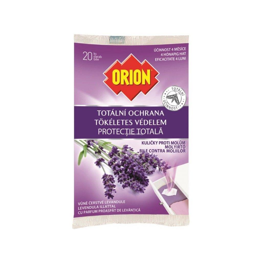 Orion Totální ochrana kuličky proti molům jsou insekticidní přípravky, které zabíjí šatní moly po dobu 4 měsíců. Každá kulička je balena jednotlivě, proto nedochází k ušpinění oděvů nebo rukou. Jedna kulička ochrání prostor cca 0,07 m3. Kuličky stačí uložit do kapes oděvů nebo mezi ně. Zanechávají příjemnou vůni levandule.